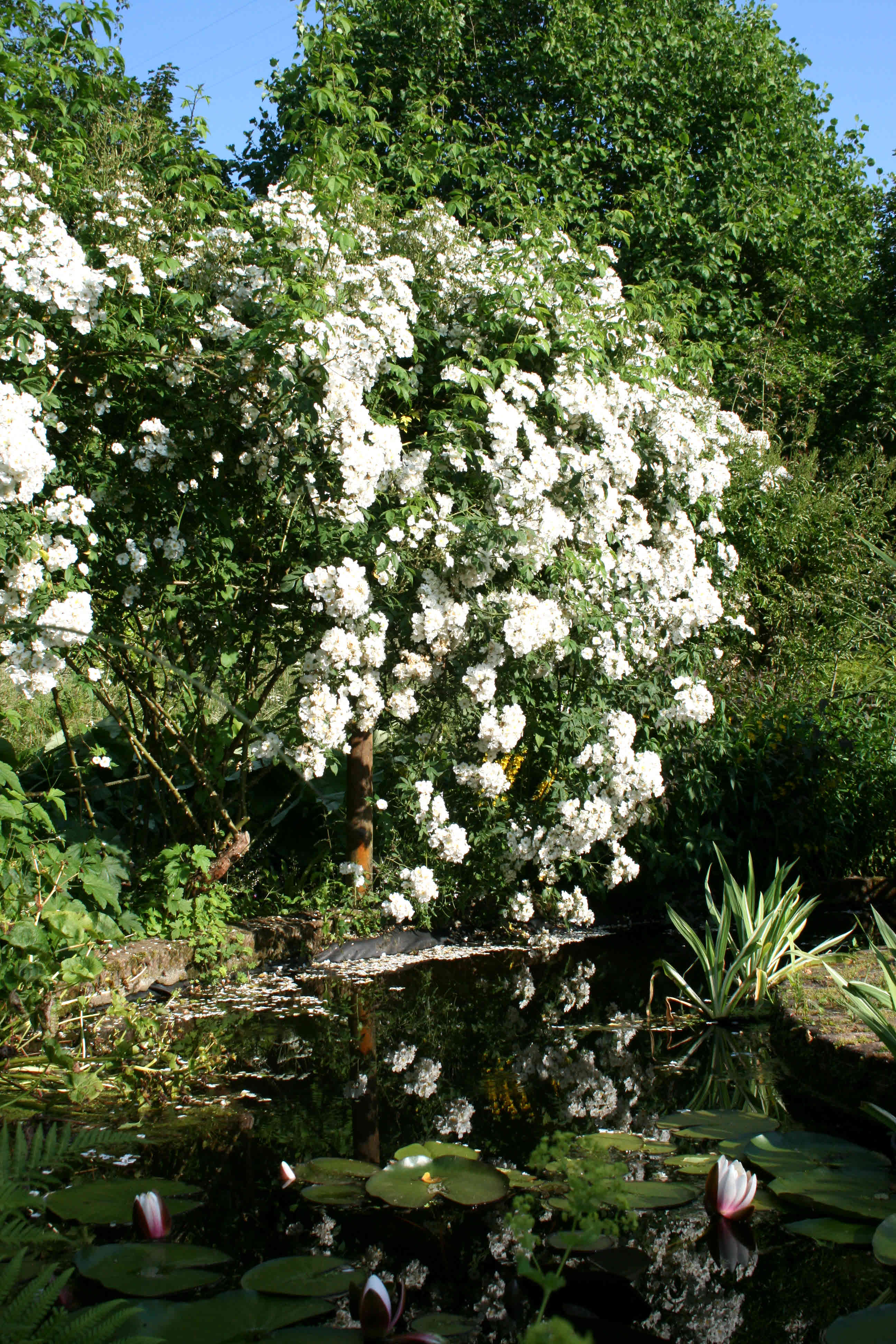 When the July sun burst upon us burning down at last, the reluctant roses were more dramatic than I can ever remember. Seagull cascaded over the pond, Margaret Merrill bent under great clusters of flowers, the new regosas’s flourished and Rosa Mundi stole the show. Even the feeble little Icebergs, planted in such terrible soggy soil, rallied stoically. Delphiniums opened somewhat coyly at last, poppies of all varieties sprang up uninvited everywhere even hostas were extraordinarily slug free.