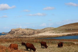 Our week passed quickly and quietly in autumn sunshine. When we weren’t talking farming with Ruth and Graham we walked around the island by Great Pool, Gweal Hill and Sinking Porth up to Hell Bay and over the hill to Fraggle Rock Bar for fish and chips and a glass of wine. We had delicious take-away paella from “Island Fish”, and huge crab sandwich lunches in the sun on the terrace of the lovely Hell Bay Hotel looking out across the ocean to America.
