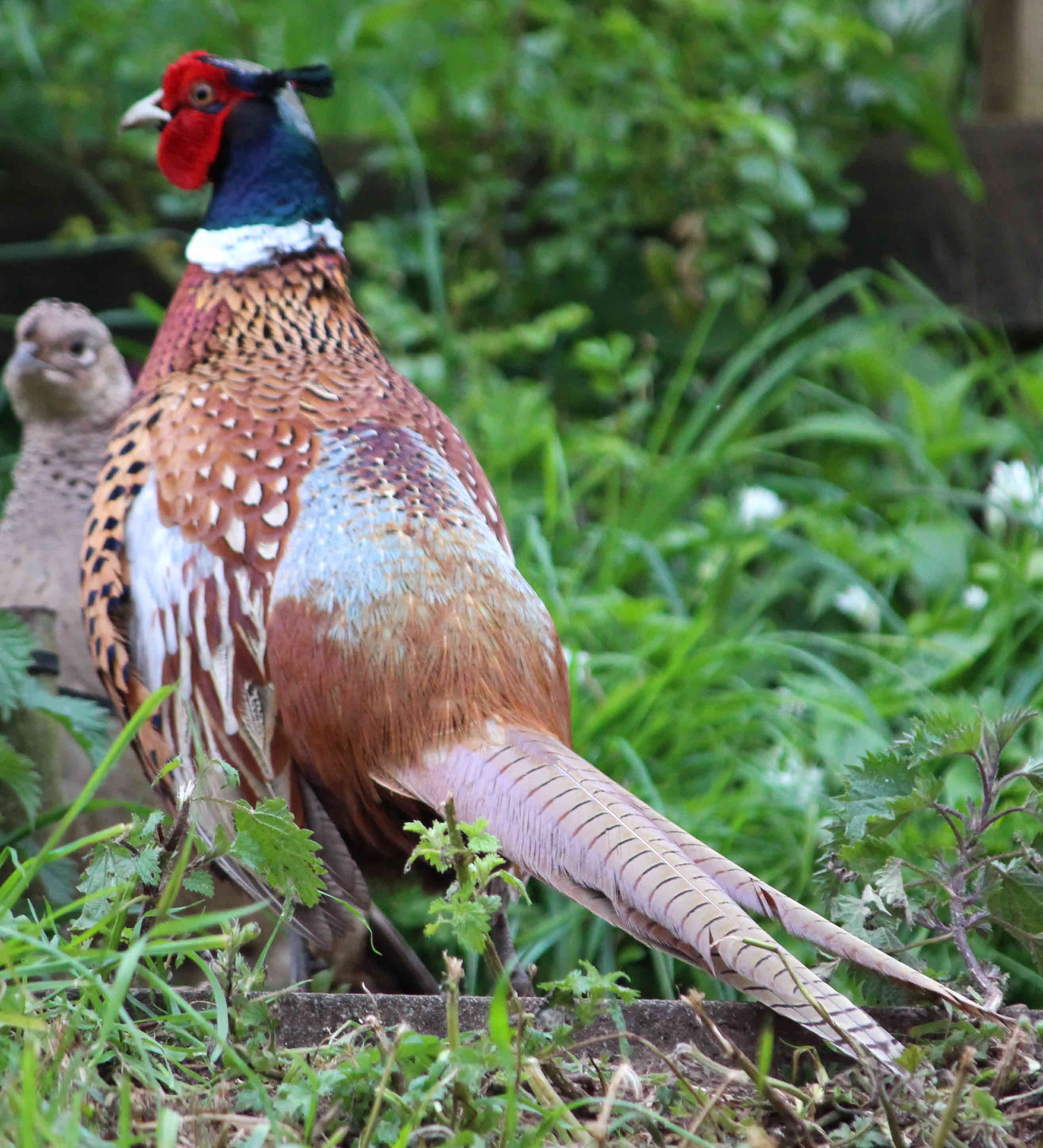 And here comes Sid again, swaggering down towards the house through the long grass, peering through the kitchen window as he passes on his way for an afternoon snack. He is our new visitor, “phasiamus colchicus” or just a common pheasant.